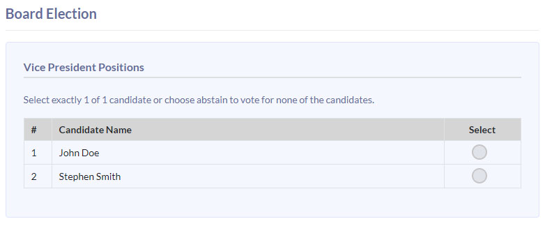 List the candidates and add a small photo and a short bio to each of them. You can also personalize them by adding preferences like write-in fields and tick options and links for additional information and your organization's logo.